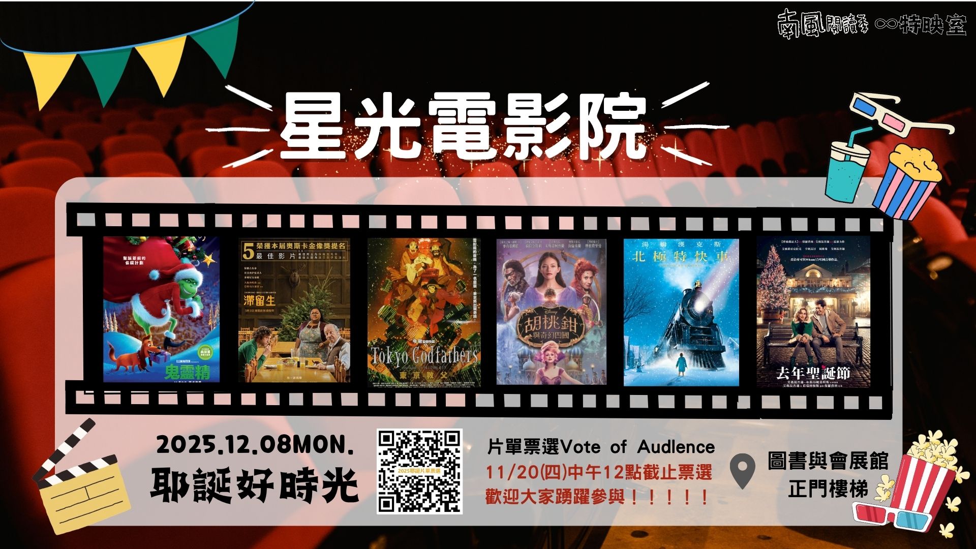 ”Happy Christmas” Starlight Cinema Movie Voting and sign-up now! ﹌﹌﹌﹌﹌﹌﹌﹌﹌﹌﹌﹌ Cast your vote for your favorite movie now! Invite your friends to sign up together The first 50 online sign-ups will get a free light meal! Join and follow us to get a lucky draw ticket — top prize: $500 vouchers! After the screening, join our quiz to win PX Mart gift vouchers! Fun, food, and prizes — sign up now! ﹌﹌﹌﹌﹌﹌﹌﹌﹌﹌﹌﹌ 1. Venue: Long stairs at the main entrance of Library and Exhibition Hall. 2. Date: Mon. 8 Dec. 2025 3. Time: 5:30 PM - 8:30 PM. The movie will be screened at 6PM. 4. Movie: voting is open until 20 Nov. Way for voting: https://forms.gle/384uZQkZn9qJr8rBA 5. Registration online: https://forms.gle/aty6WbeRY8DC3VjT6 6. How to apply: online registration, maximum number of applicants is about 50 groups (2 person as a group). 7. Online registration will be closed on 28 Nov. 12PM, admission list will be announced on the next day. 8. Once the number of applicants is full, registration will be closed subsequently. 9. Precautions: • This event is free, and will offer a two-person snack for a group. (limit for 50 groups). • All students can get a lucky draw ticket at sign-in. A prize quiz follows the screening. • Wear comfortable and warm clothes on that day and just enjoy the film. • If you have any respiratory symptoms or body unwell, please stay at home. • If there are any unaccomplished matters, the organizer can make additional explanations at any time.