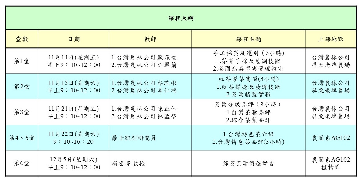 開課時段:星期五、星期六;節次2~4節(上午9:10~12:00)、節次5-7節(下午13:30~16:20) 授課時數:18小時 授課日期: 第1堂:11月14日(星期五) 早上9:10~12:00 第2堂:11月15日(星期六) 早上9:10~12:00 第3堂:11月21日(星期五) 早上9:10~12:00 第4、5堂:11月22日(星期六) 早上9:10~12:00、下午13:30~16:20 第6堂:12月5日(星期五) 早上9:10~16:20 授課地點:農園系AG102、植物園、台灣農林公司