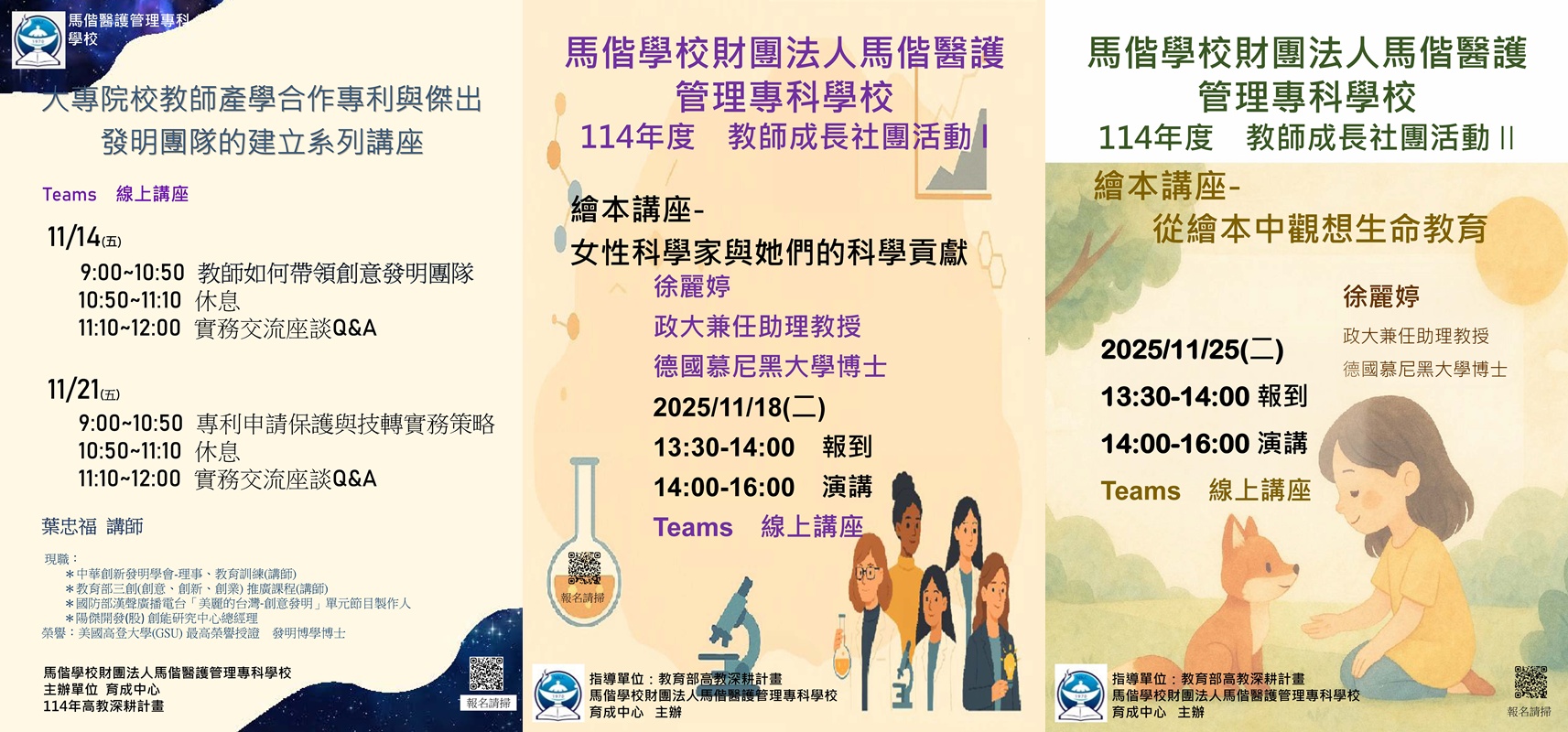 《研習活動》馬偕醫護管理專科學校114年11月份辦理「教師專業成長系列研習活動」線上講座,敬邀本校教職員踴躍報名參加