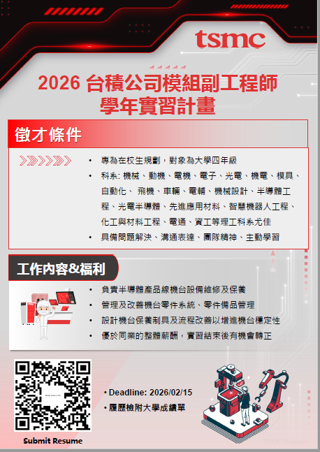 2026MAE(模組副工程師)學年實習-徵才說明 實習對象:大四學生(今年度大三學生) 實習期間:2026/07 - 2027/06 (為期一年,暑假+上學期+下學期) 實習地點:高雄廠區 職務說明: 1.負責半導體產品線機台設備維修及保養 2.管理及改善機台零件系統、包含廠商與下包商之零件備品管理 3.設計機台、保養制具及流程改善以增進機台穩定性 4.實習結業標準:完成新人訓練暨值班考核 5.實習結束後有機會轉正,成為正職員工 上班時間:週一到週五 08:30-17:30,週休二日 履歷投遞:請至台積官網登錄履歷,網址: https://bit.ly/tsmcmae2026_info ,期限自即日起-2026/2/15截止。