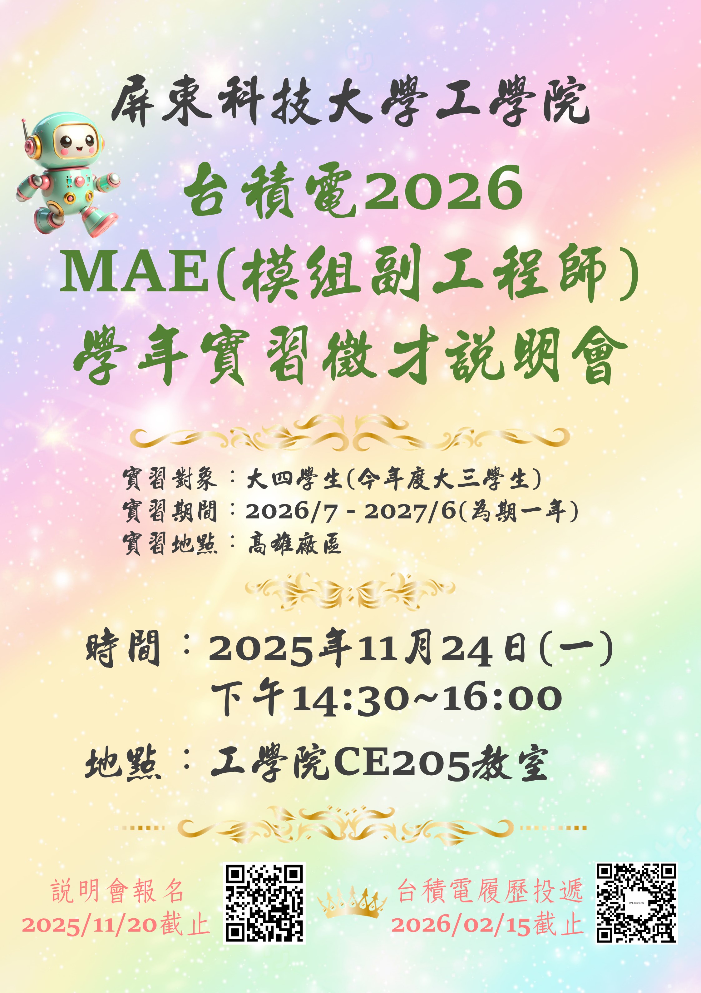 工學院 X 台積電【2026MAE學年實習專案徵才計畫】說明會 時間:114年11月24日(星期一)下午14:30-16:00 地點:工學院大樓CE205教室 報名網址: https://forms.gle/VPRzV6p5c87rtvqY6 (截止日為114/11/20) 鼓勵有興趣同學踴躍參加!