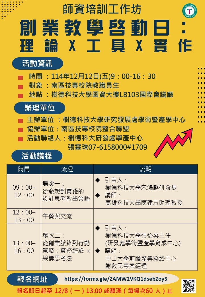 《工作坊》樹德科技大學辦理「創業教學啟動日:理論 × 工具 × 實作」師資培訓工作坊,敬邀本校師生踴躍報名參加,報名至12月08日止