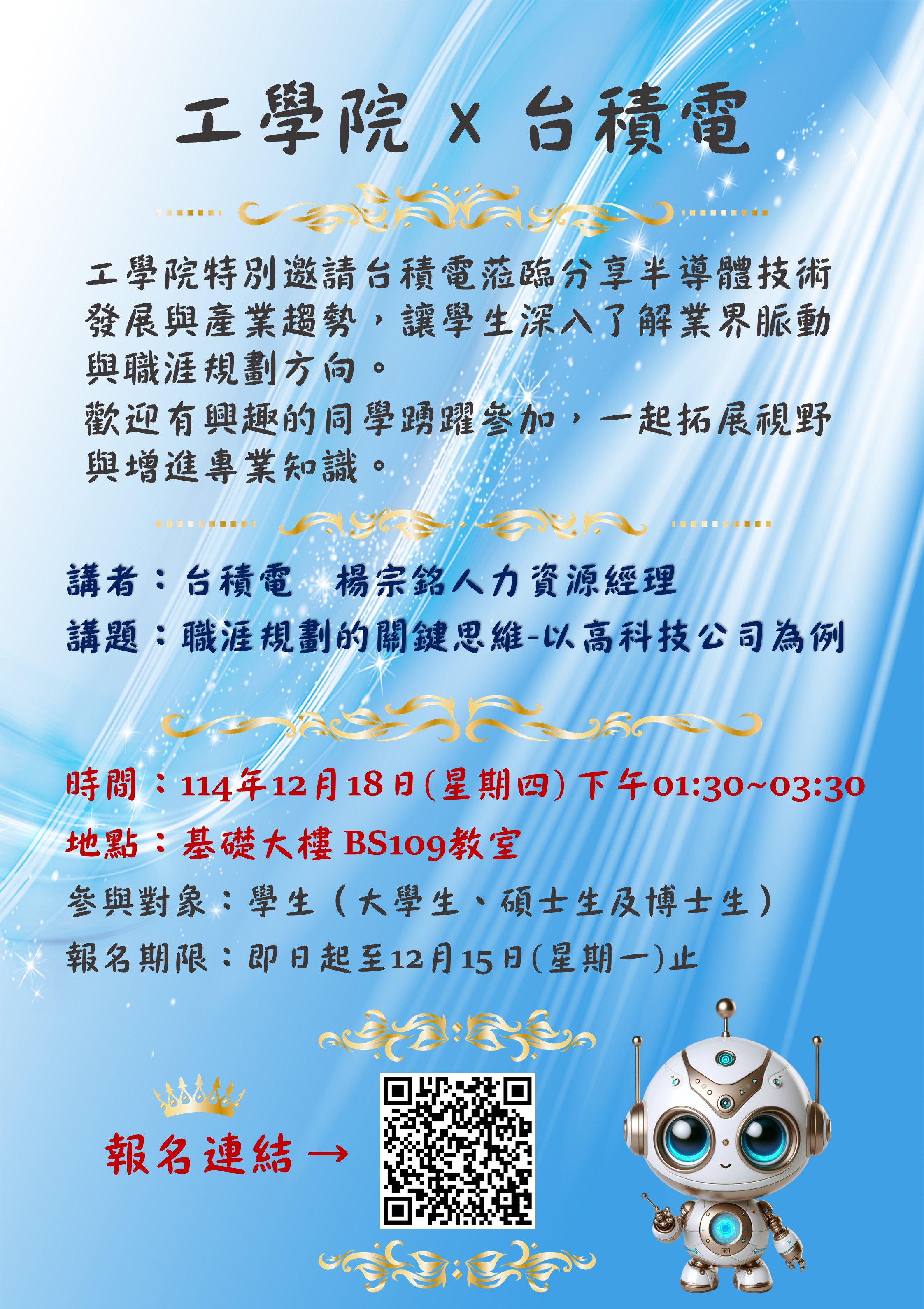 工學院 x 台積電「專題演講」,歡迎有興趣的同學踴躍報名參加