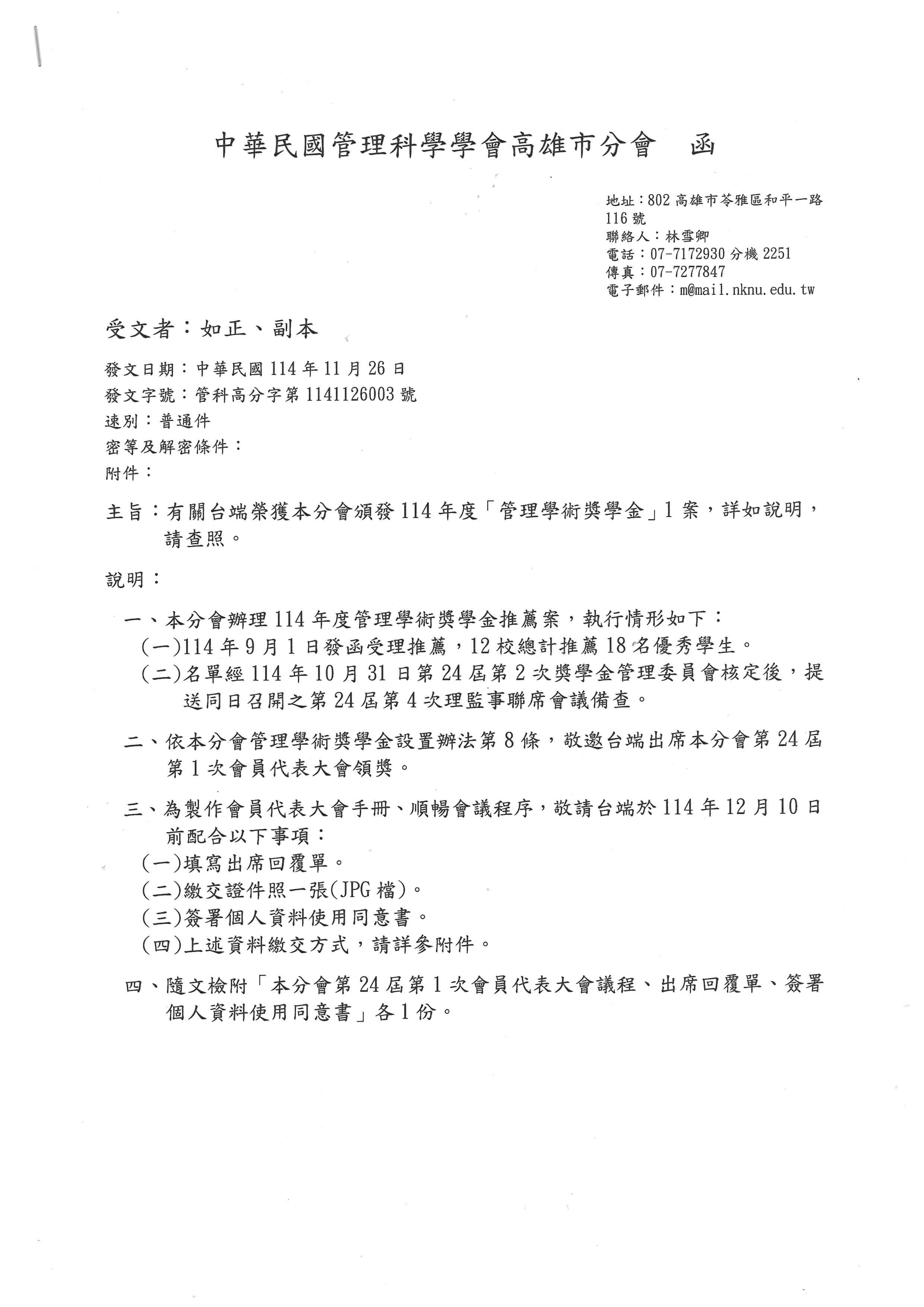 餐旅管理系汪仲仁老師指導研究生蔡期勳榮獲中華民國管理科學學會高雄市分會114年度管理學術獎學金
