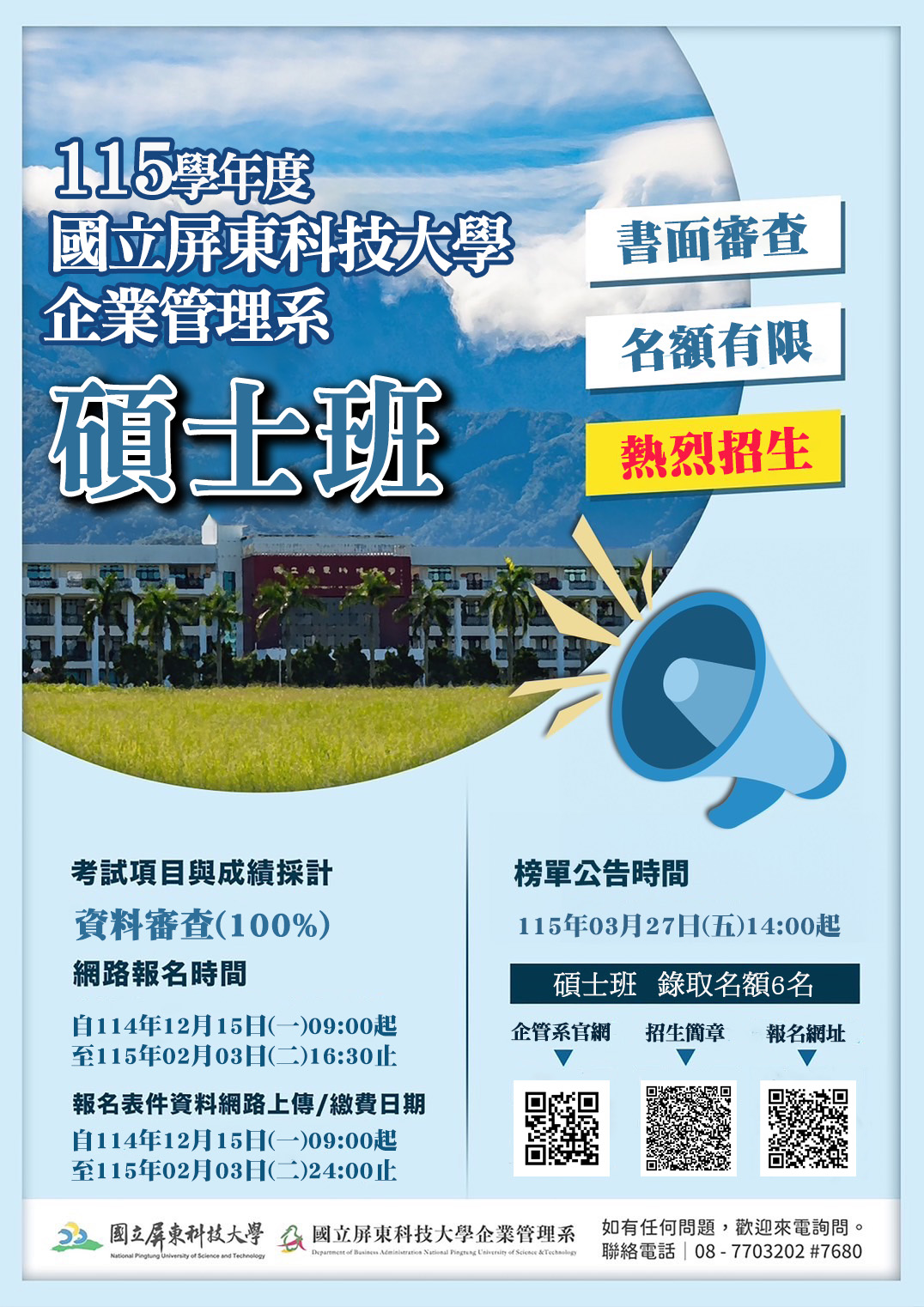 屏科大企業管理系【115學年度-碩士班招生】開始報名嚕! (12/15 09:00開始報名至115/2/3 16:30止),請把期限,歡迎踴躍報考加入企管。