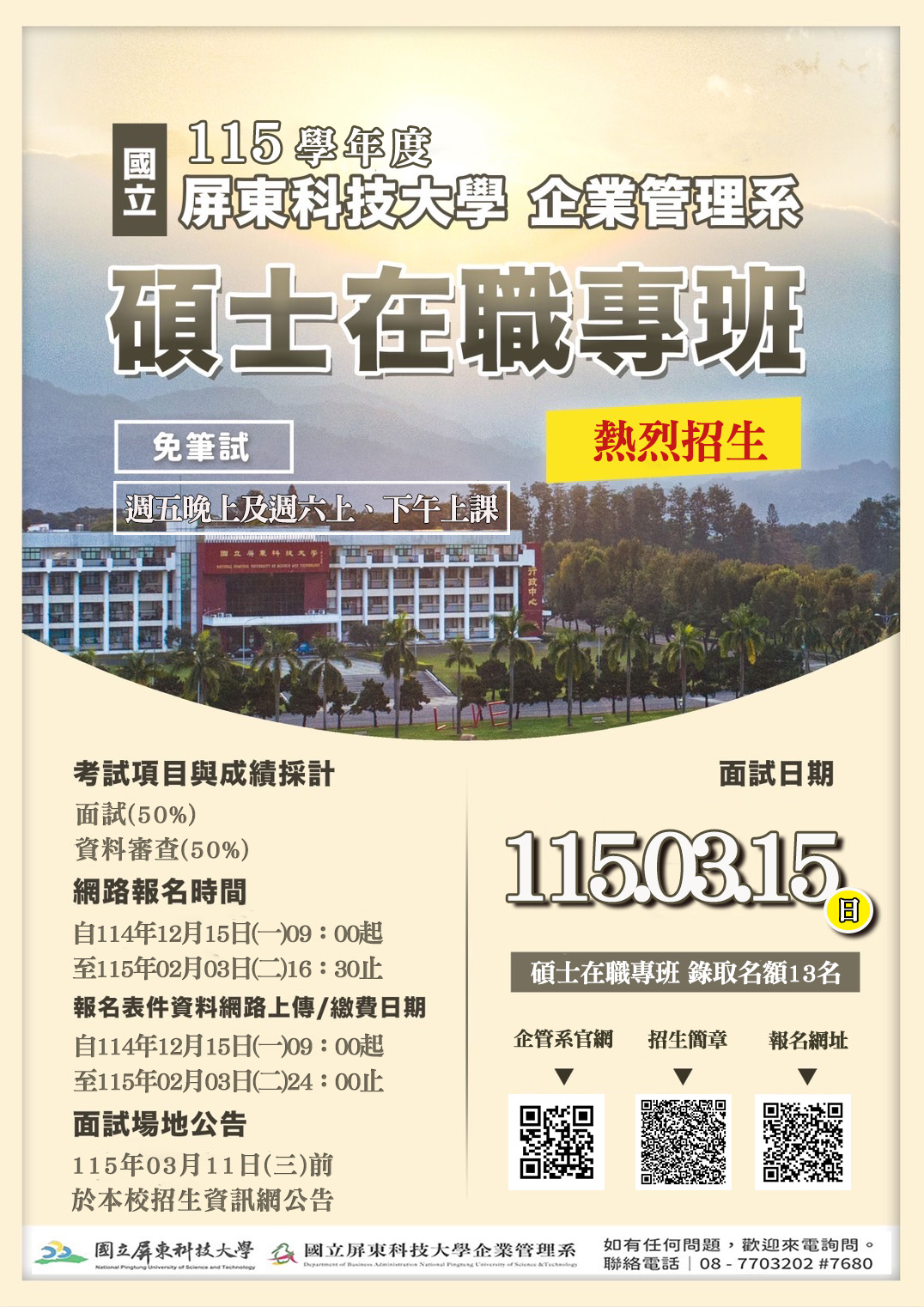 屏科大企業管理系【115學年度-碩士在職專班招生】開始報名嚕! (12/15 09:00開始報名至115/2/3 16:30止),請把期限,歡迎踴躍報考加入企管。