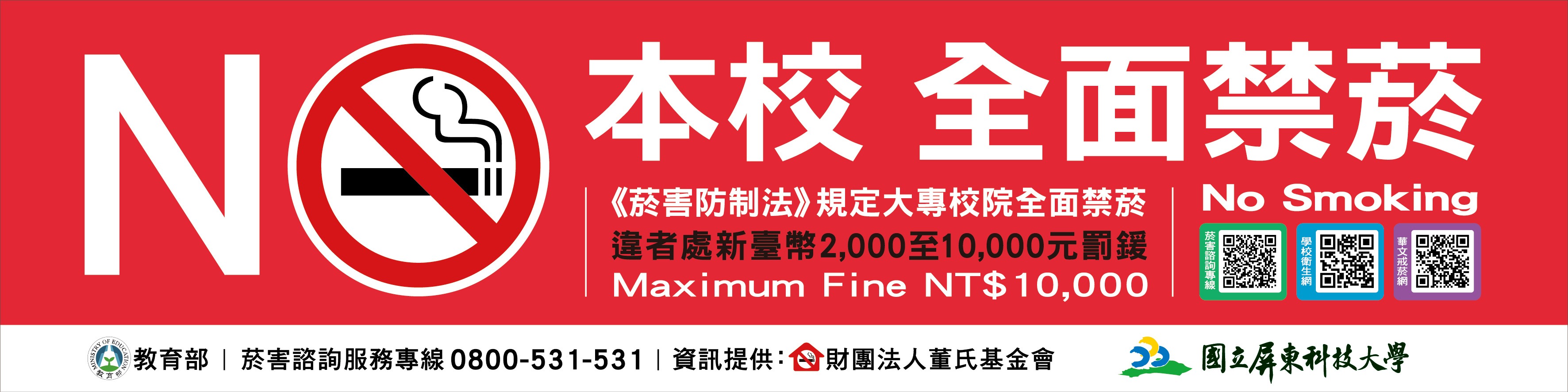 1.本校為無菸校園,校園內全面禁菸(含電子煙、加熱菸),違者依《菸害防制法》最高可處10,000元罰鍰,亂丟菸蒂行為依《廢棄物清理法》最高可處6,000元罰鍰。