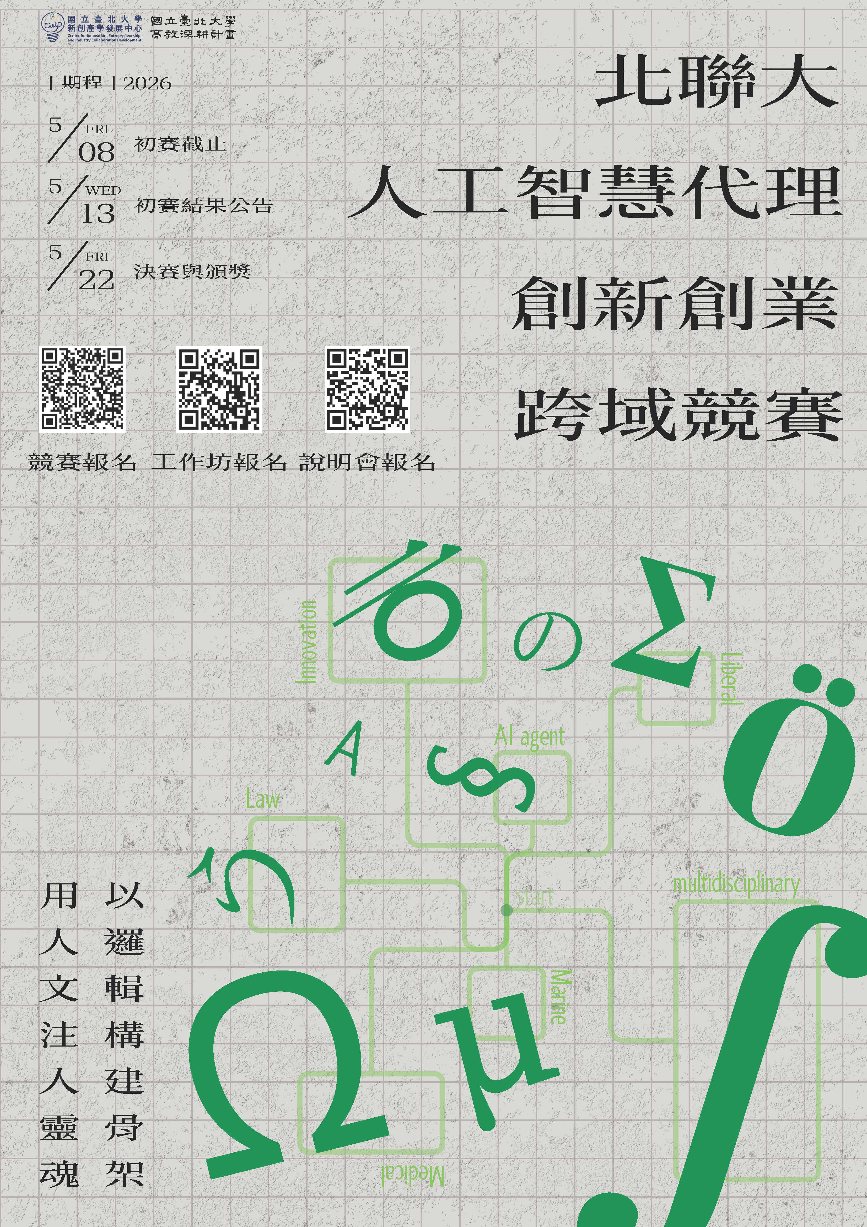 《競賽》國立臺北大學辦理「北聯大-人工智慧代理創新創業跨域競賽」,敬邀本校師生踴躍報名參加,報名至05月08日止