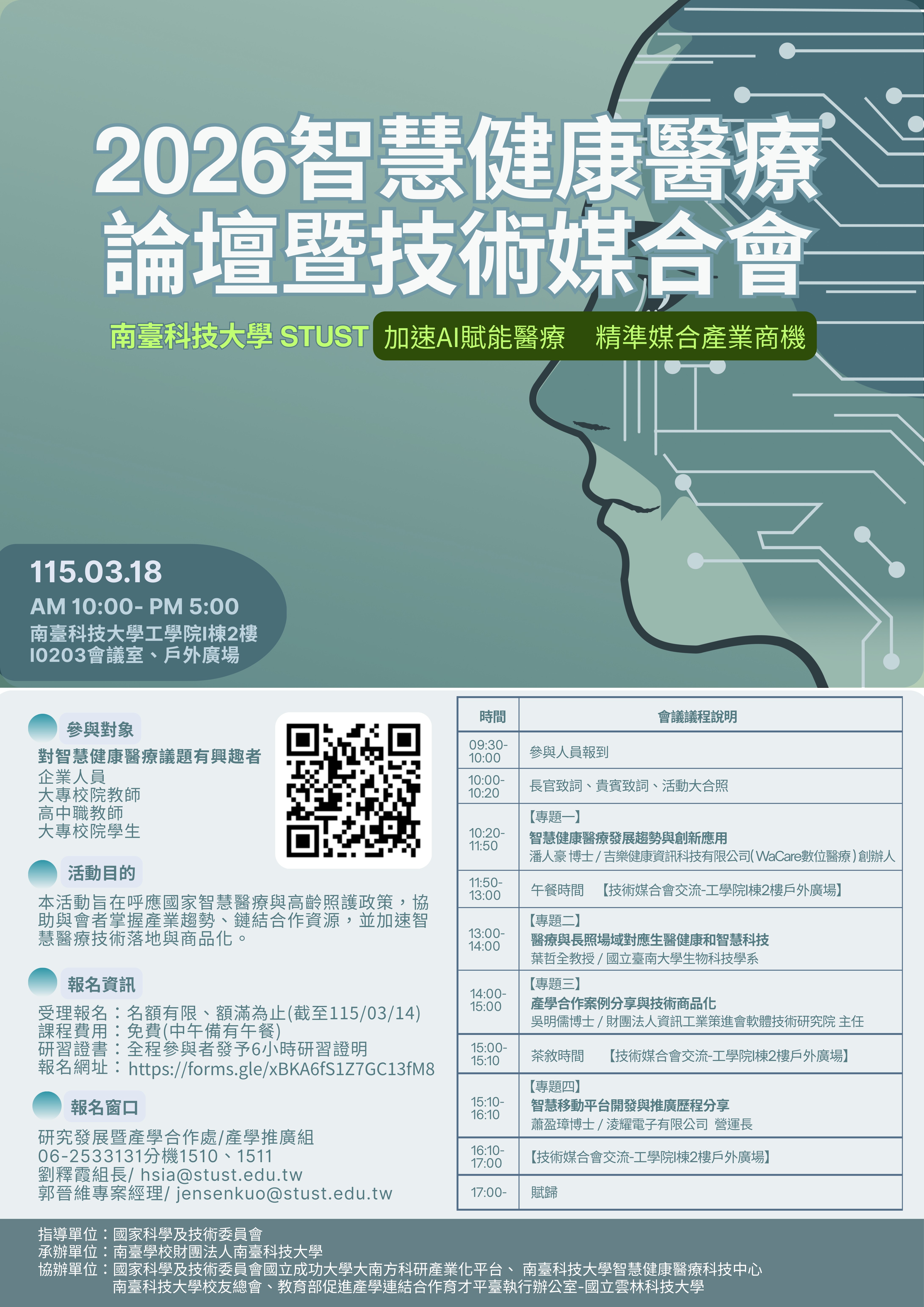 二、活動資訊: (一)活動日期:115年03月18日(三) (二)活動時間:上午10:00~下午5:00 (三)活動地點:南臺科技大學工學院I棟I203會議室
