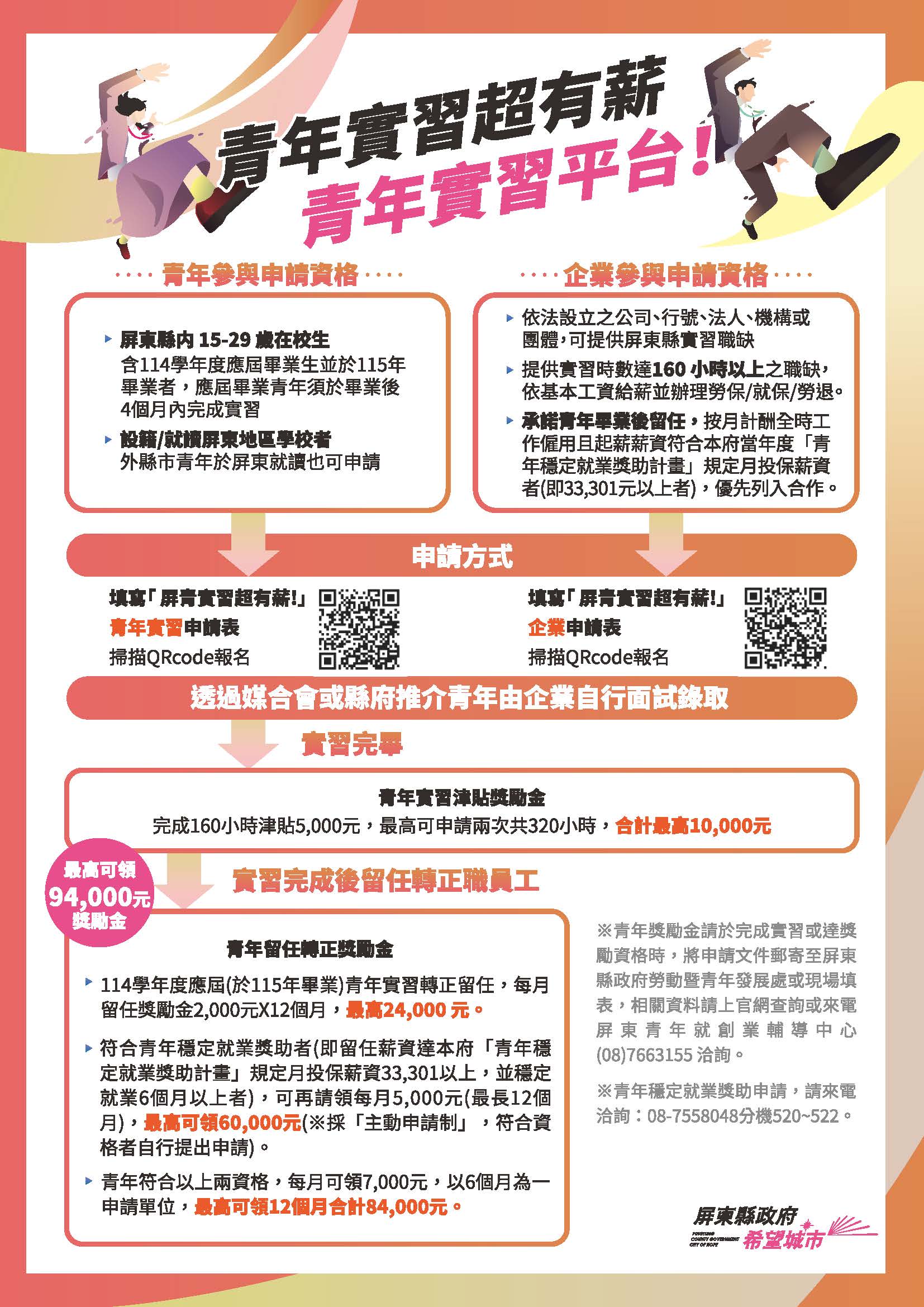 一、本府為協助青年建立正確的工作態度與職場倫理,為未來正式踏入職場作準備,推出「屏青實習超有薪」,期透過產官學三方合作共同推動人才培育,提供青年至企業實習,藉由「做中學、學中做」培養青年具備即戰力,畢業後能順利與就業市場接軌,留在本縣穩定就業。 二、申請實習對象及資格: (一)年滿15歲至未滿30歲在學青年(以下簡稱青年)。 (二)設籍屏東縣或就讀屏東縣各高中職、大專校院、研究所具學籍之青年。【含114學年度應屆畢業生(115年畢業者)】 (三)應屆畢業青年須於畢業後4個月內完成實習。 三、青年申請方式請逕上屏東青航站(https://new.ycpt.org.tw/vacation-job)填寫「屏青實習超有薪」青年實習申請表,後續將有專人進行聯繫及服務,或電洽屏東青年就創業輔導中心(08)766-3155。 四、本計畫職缺由依法設立之事業單位,提供執行職務地點在屏東縣的實習職缺,並提供實習時數達160小時以上之職缺,須依基本工資給薪並為實習青年投保勞保、就保及勞退金,且提供實習後轉正職缺(畢業後留任,按月計酬全時工作僱用且起薪薪資符合本府當年度「青年穩定就業獎助計畫」規定月投保薪資者,即33,301元以上者)。 五、本府於115年3月28日(六)辦理徵才媒合會,在此邀請青年共襄盛舉,現場除了有面試媒合、履歷健檢,還有職人講座等,讓青年一站掌握未來,相關資訊摘述如下: (一)活動日期:115年3月28日(星期六)上午9至12時。 (二)活動地點:屏東縣政府勞動暨青年發展處1樓(屏東市自由路17號)。