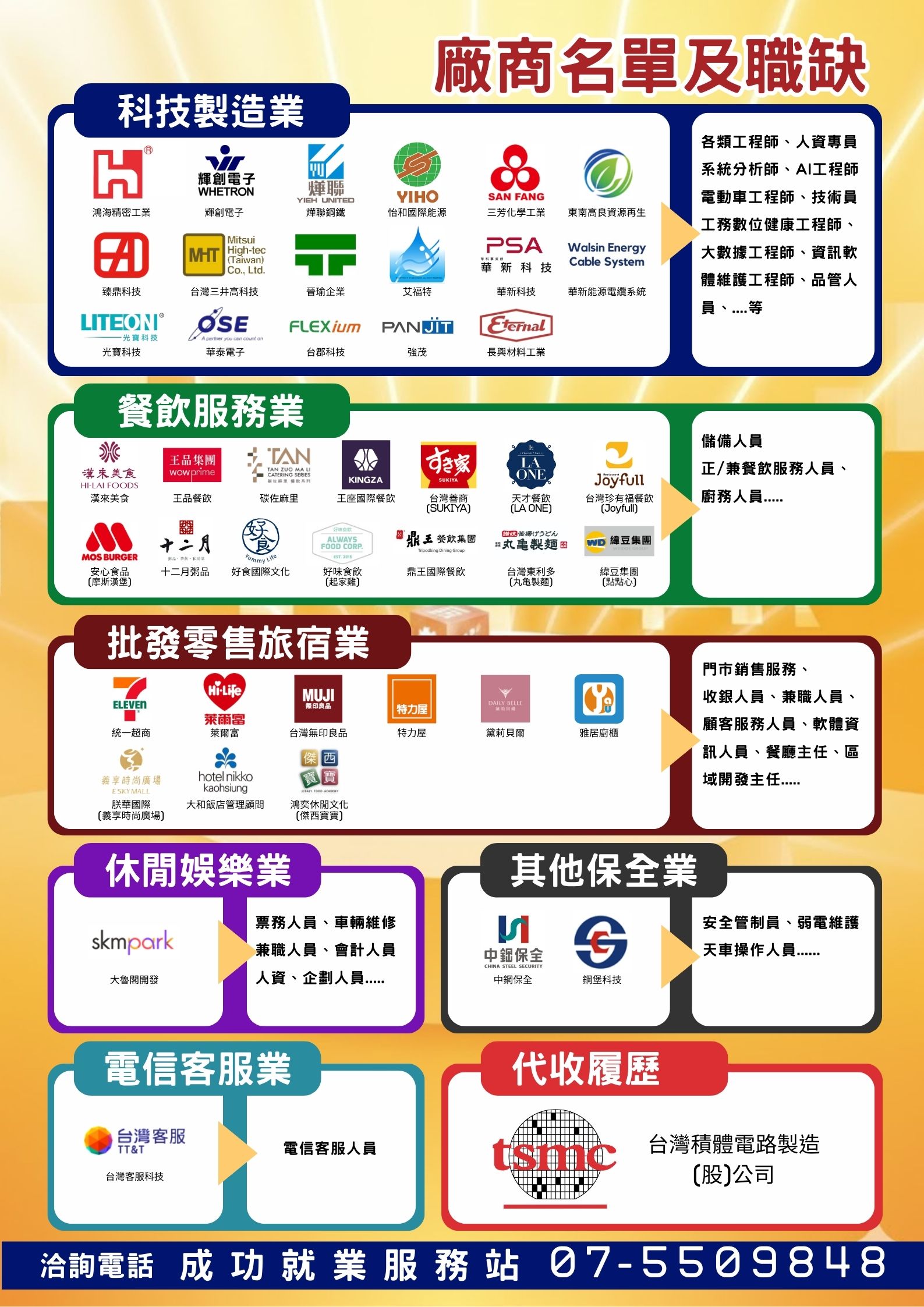 高雄市政府勞工局將於3月21日(六)上午9:00至12:00於福誠高中活動中心(高雄市鳳山區五甲三路176號)舉辦大型現場徵才活動,敬請把握機會! ●邀請45家廠商,超過1,000個工作機會! 包含鴻海精密、光寶科技、長興材料、漢來美食(島語)、王品集團、無印良品、日航酒店、sukiya、點點心、本村炸雞、台灣客服等45家企業,提供工程師、技術員、資訊軟體維護、正兼職餐飲服務人員、餐廳主任、儲備幹部、門市人員、人資、計時人員等職缺。 ●職缺搶先看: https://reurl.cc/mkWNvY ●洽詢電話07-5509848(成功就業服務站)