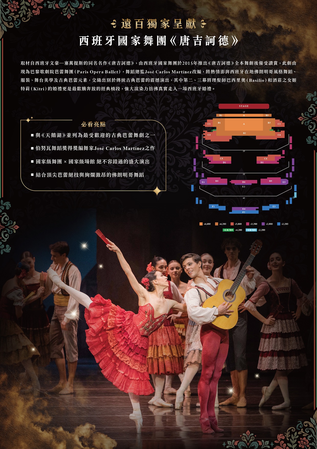 1.藝文活動為多元藝術的展現,為拓展台灣觀眾的藝文素養與舞蹈藝術之視野,該公司引進與《天鵝湖》並列為最受歡迎的古典芭蕾舞劇之一的《唐吉訶德》,由西班牙最具代表性的「西班牙國家舞團」全本演出。