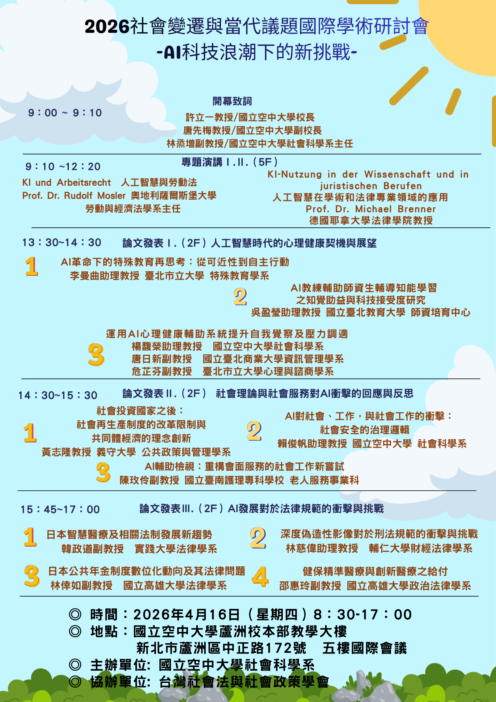 一、國立空中大學社會科學系與台灣社會法與社會政策學會於中華民國115年4月16日(星期四)8時30分至17時,在國立空中大學校本部教學大樓五樓國際會議廳及二樓智能會議室,合辦旨揭國際學術研討會,本次特別邀請奧地利薩爾斯堡大學勞動與經濟法學系主任Prof. Dr. Rudolf Mosler,和德國耶拿大學法律學院教授Prof. Dr. Michael Brenner蒞校專題演講。