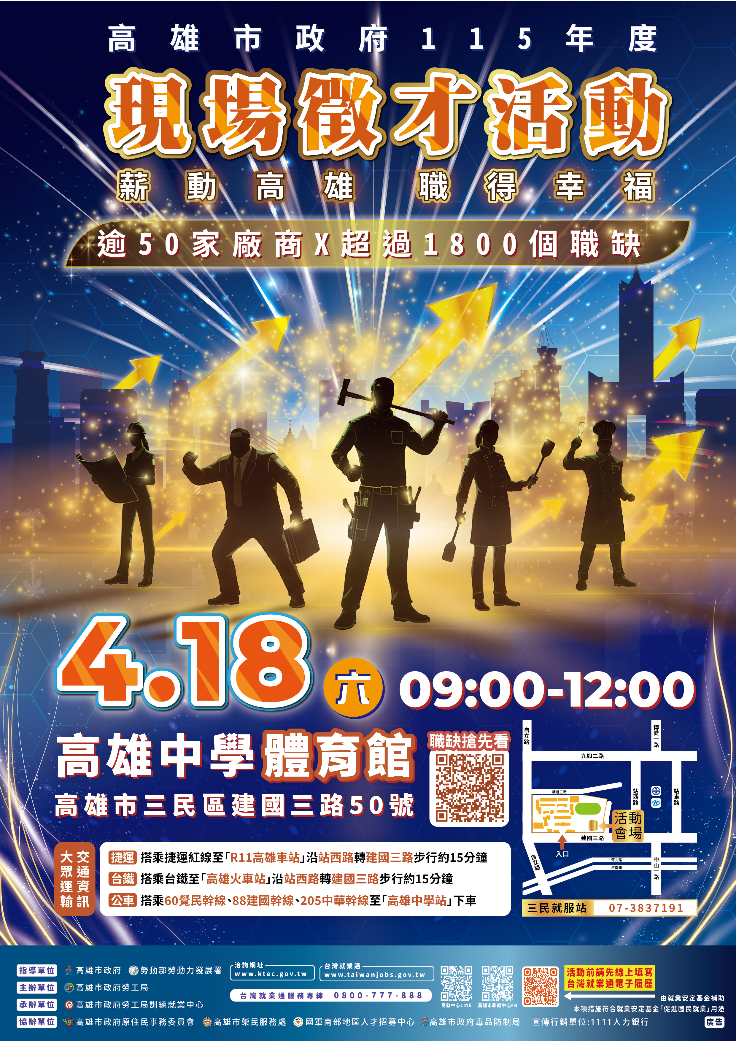 高雄市政府勞工局將於4月18日(六)上午09:00至12:00於「高雄中學體育館」(高雄市三民區建國三路50號)舉辦大型現場徵才活動,敬請把握機會! ●邀請50家廠商,超過1,800個工作機會! 包含鴻海精密、臻鼎科技、公準精密、華泰電子、長興材料、御盟酒店、王品餐飲、王座、築間、爭鮮、藤園UDON、義美、摩斯、石二鍋、特力屋、全國電子、昇峰起重、台灣挑戰者汽車保修、享溫馨、統一超商、全聯、全家等50家企業,提供工程師、管理師、技術員、司機、資訊軟體維護、餐飲內外場服務人員、店長、經理、儲備幹部、門市與專櫃人員、客服、業務人員、兼職計時人員等職缺。 ●職缺搶先看: https://reurl.cc/r0ZkWy ●洽詢電話07-3837191(三民就業服務站)