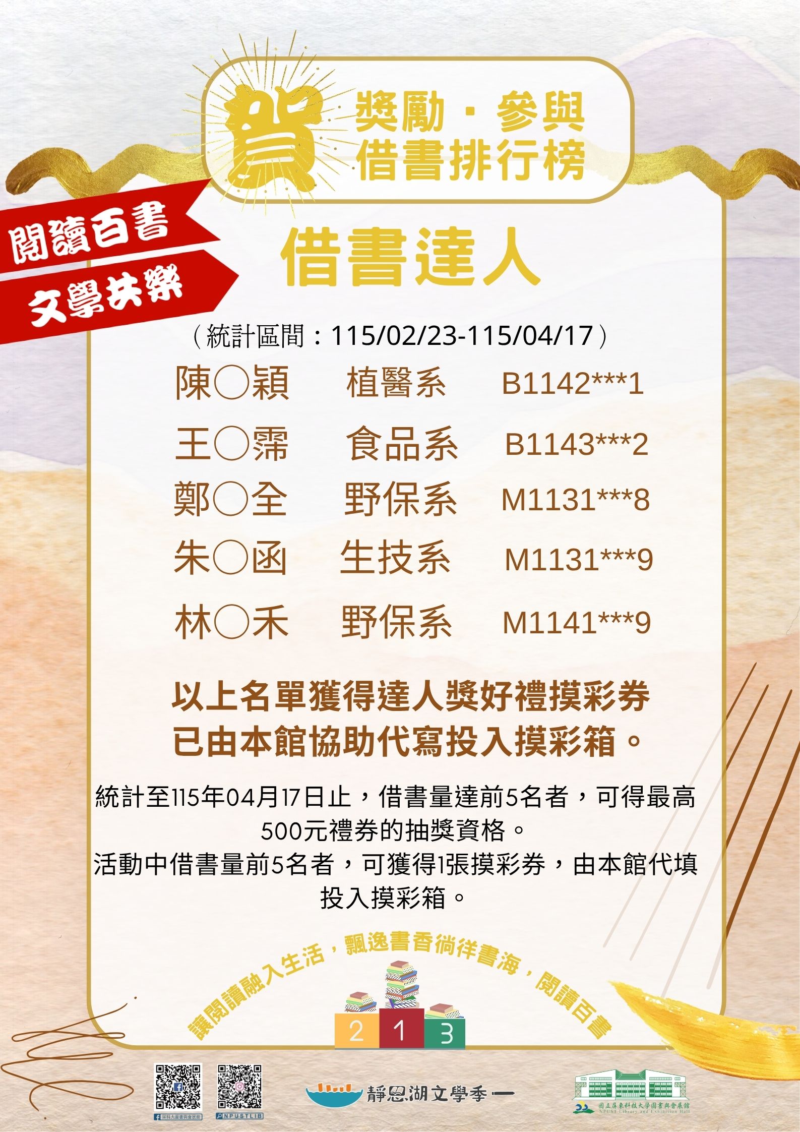 📍活動名稱:獎勵。參與「閱讀百書,借書排行榜」 📍統計時間:115.2.23─4.17 📍活動獎勵:活動中借書量前5名者,可獲1張摸彩券,由本館代填投入摸彩箱 📍活動說明:依本館自動化系統於活動期間統計,並配合達人獎好禮抽獎日期,於活動中與活動末統計學生借書量: 1️⃣活動中(開學至115年4月17日止)借書量前5名者,可獲1張摸彩券,由本館代填投入摸彩箱。 2️⃣活動末(開學至115年6月08日止)總借書量達前5名者或借書量達70冊以上者,可得摸彩券數量依序為第一名6張、第二名5張、第三名4張、第四名3張、第五名2張,其餘借書量達70冊以上者皆可獲得1張,由本館代填投入摸彩箱。