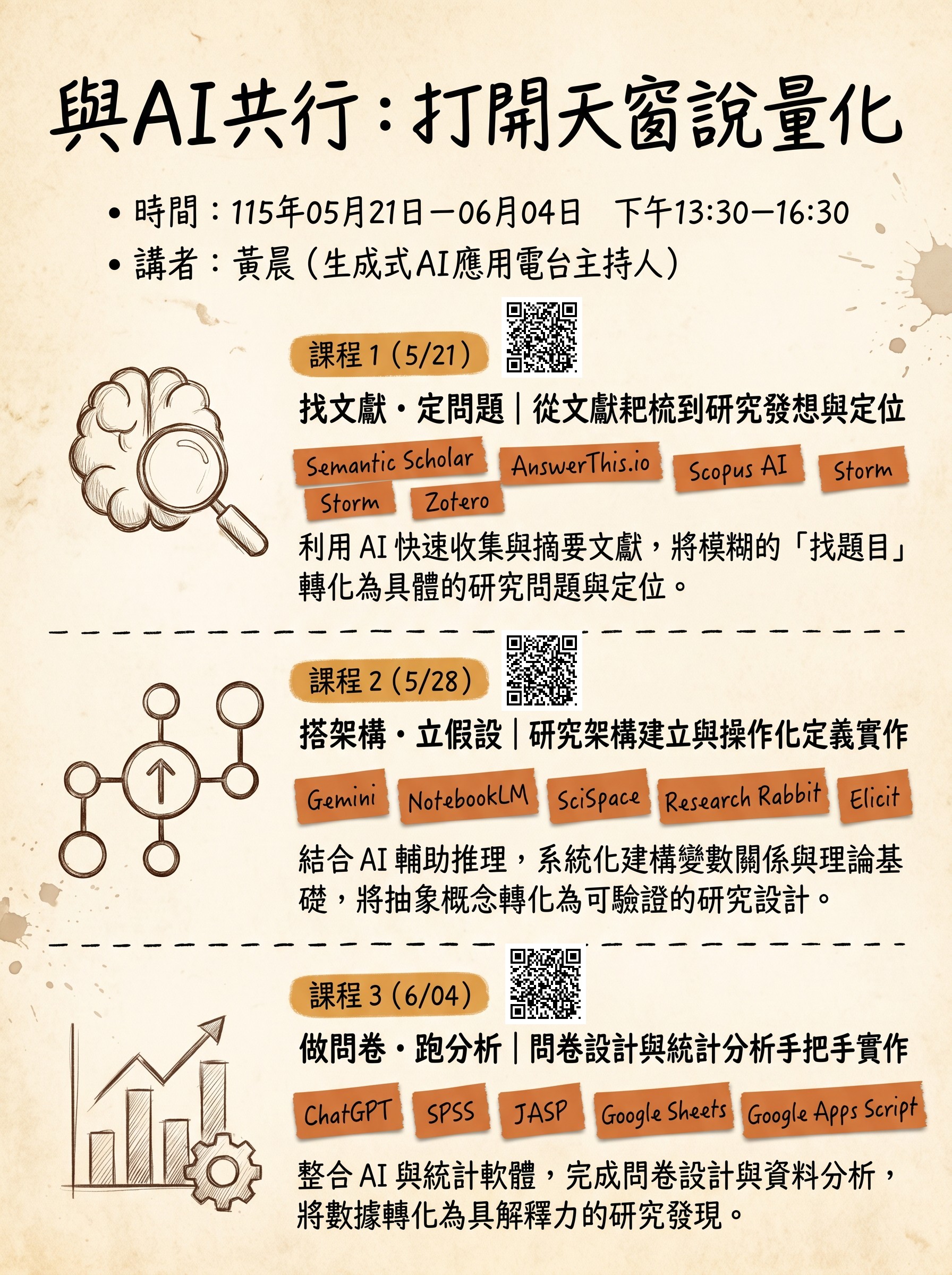 二、報名期限與方式:即日起至活動辦理前請至本校活動報名系統報名。 (一)5月21日「與AI共行:打開天窗說量化(1)」主題:找文獻・定問題|從文獻耙梳到研究發想與定位(3小時)http://qna.tnu.edu.tw/portfolio/actview.html?id=1330 (二)5月28日「與AI共行:打開天窗說量化(2)」主題:搭架構・立假設|研究架構建立與操作化定義實作(3小時)http://qna.tnu.edu.tw/portfolio/actview.html?id=1331 (三)6月4日「與AI共行:打開天窗說量化(3)」主題:做問卷・跑分析|問卷設計與統計分析手把手實作(3小時)http://qna.tnu.edu.tw/portfolio/actview.html?id=1332