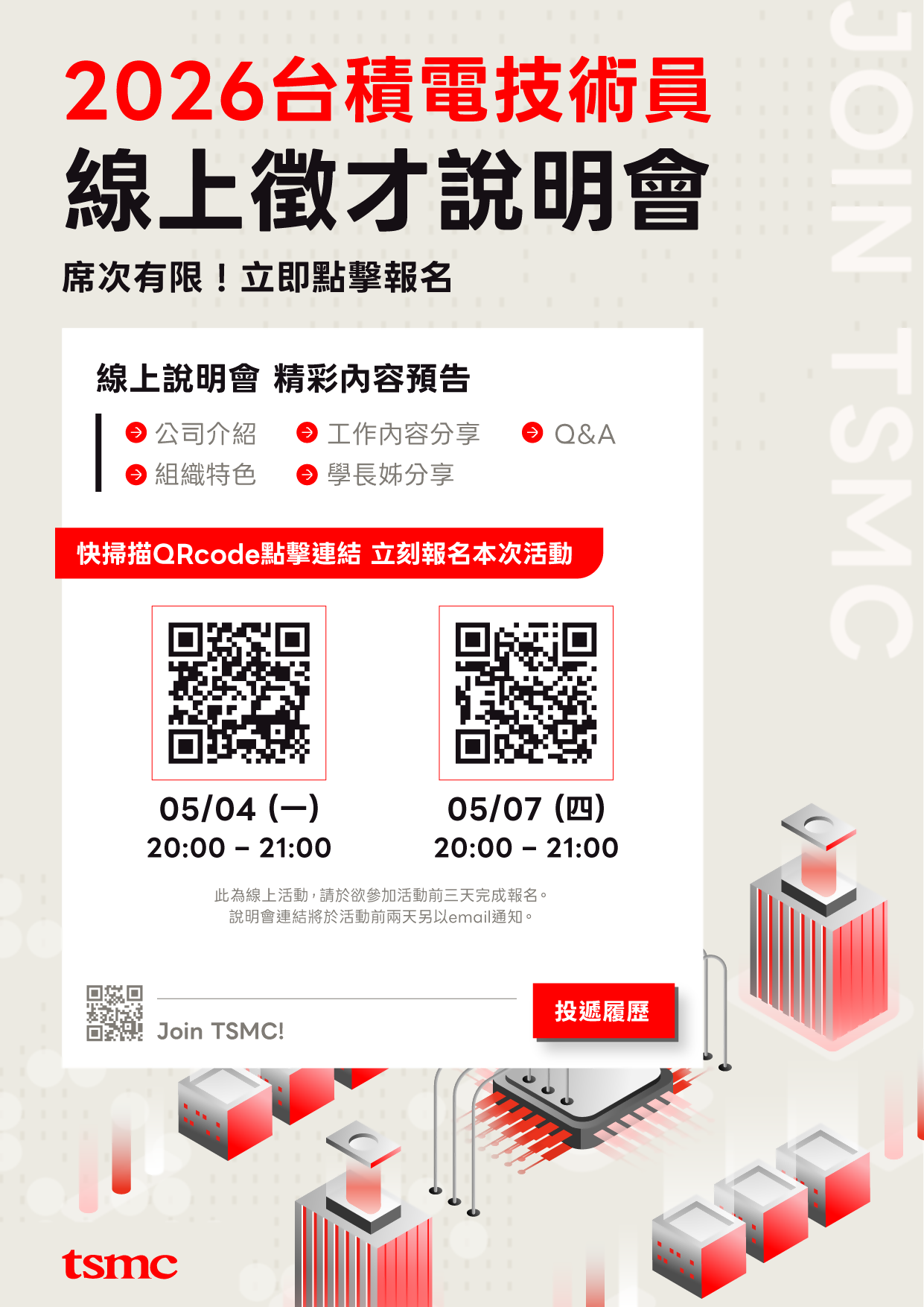 台積電正在積極招募技術員,並將於5/4(一) & 5/7(四) 20:00-21:00舉辦線上徵才說明會,活動內容包含公司介紹、組織特色、工作內容分享、學長姐分享以及Q&A,希望能透過此次活動,讓有興趣的夥伴深入了解台積電技術員的職務及工作環境。