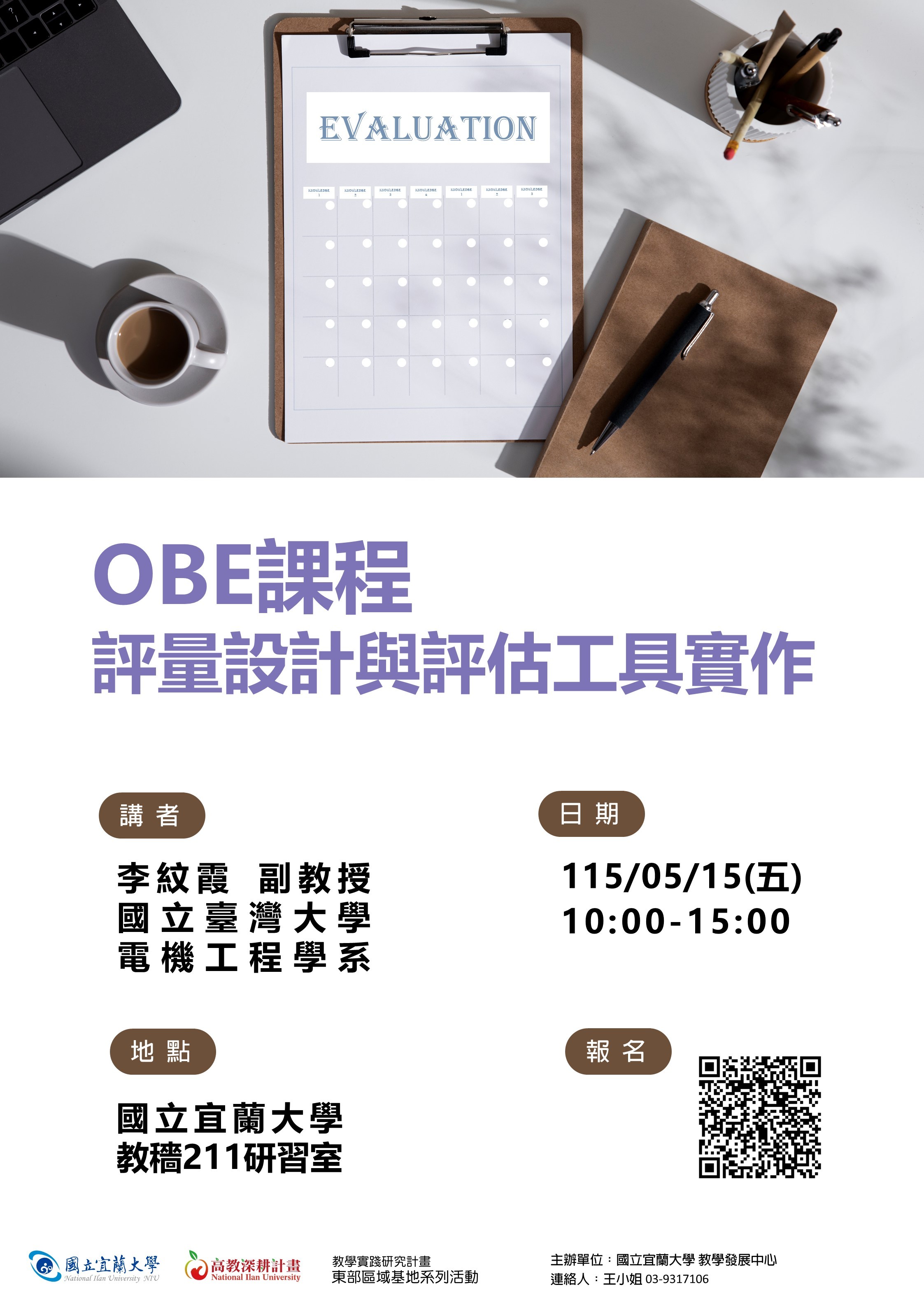 一、活動資訊如下: (一)活動時間:115年5月15日(五) 10:00~15:00。 (二)活動名稱:「OBE課程評量設計與評估工具實作工作坊」。 (三)講者:李紋霞兼任副教授( 國立臺灣大學電機工程學系)。 (四)活動地點:國立宜蘭大學綜合教學大樓211研習室(校址:宜蘭市神農路一段一號)。 (五)報名網址:https://forms.gle/FsY3wKmLXxydKVBR8
